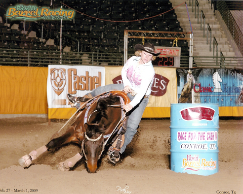 It's not going too far to say that Diamonds very special and close to my heart. After Dad’s death I really put a lot into Diamond’s future. He cut himself in the shoulder on a T post in December of 2006 and was off for 6 weeks. 2007 would see Diamonds make his debut to the barrel racing arena. I ran him 4 times before I took off rodeoing in the summer of 2007. The 3rd time he ever ran the barrels won 3rd in the 1D at a jackpot. That fall when I started back running him he went straight to winning and winning we have done since then. He has won in the top 3 places at about 20 jackpots. He has placed at the amateur rodeo at Brenham, Corsicana, and Centerville. He was 17th out of 2,000 horses at the Glen Rose WBR in 2008. He is currently my back up rodeo horse and will find himself in the rodeo trailer going down the road to help in the journey to the NFR in 2009.